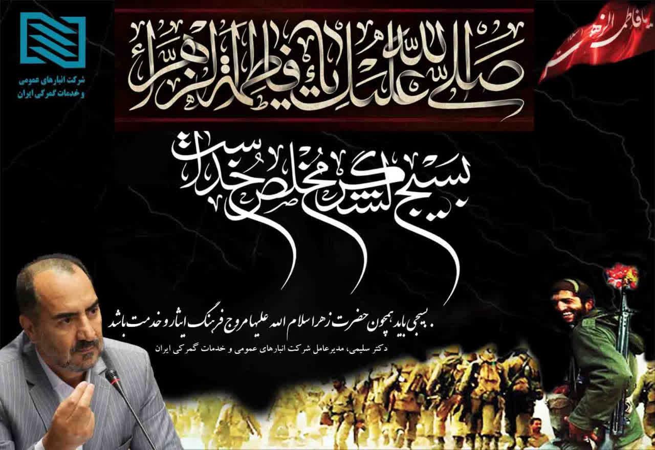 اینجانب ضمن عرض تسلیت سالروز شهادت دخت نبی مکرم اسلام ، همسر معظم امیرالمومنین علــی علیــه الســلام حضرت صدیقه طاهره ، فاطمه الزهرا سلام الله علیها ، قرار داشتن در هفته بسیج، این یادگار جاوید حضرت امام خمینی(ره)، را به بسیجیان آزاده و ایثارگر، به‌خصوص بسیجیان خدوم خانواده بزرگ شرکت انبارهای عمومی و خدمات گمرکی ایران گرامی میدارم و از خداوند متعال سربلندی ایران اسلامی و توفیقات روزافزون تمام همکاران گرامی را ضل توجهات حضرت ولی‌عصر(عجل الله تعالی فرجه الشریف) و در پرتو منویات رهبر معظم انقلاب (مدظله‌العالی) مسئلت دارم.